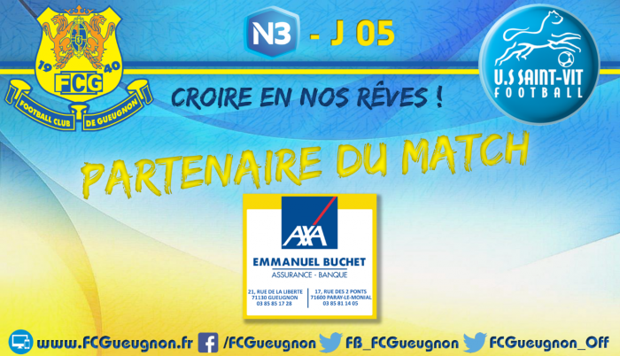 Cette année, l’agence AXA tenue par Emmanuel BUCHET, supporter du FCG depuis de nombreuses années, offrira le « ballon du match » lors de la rencontre de ce samedi 30 Septembre 2017 au stade Jean Laville où les forgerons recevront l’US Saint-Vit.