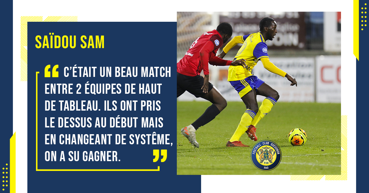 « Oui, on était un peu dégoutés toute la semaine après la match du Racing Besançon par rapport à notre prestation… On aurait voulu repartir de ce déplacement avec des points. Ce soir à domicile, on était motivés et on s’est dit qu’il fallait marquer le coup. C’est ce qu’on a fait et ça s’est vu au niveau du score ! »
