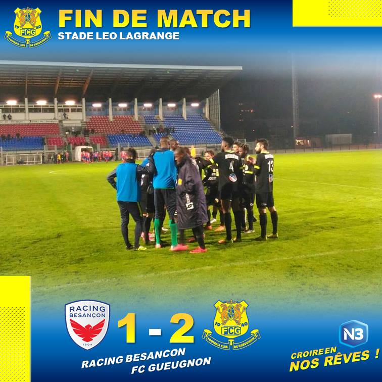 Au retour de la pause, Sékou Coumaré à nouveau seul face au but de Steven Bouchité rate le cadre (60e). Dans cette seconde période, Gueugnon tente sa chance essentiellement en contre, le Racing Besançon monopolise le ballon sans forcément se montrer dangereux et la lumière viendra d’une frappe des 25m de Samuel Robert qui vient se loger dans la lucarne (1-1 86e).