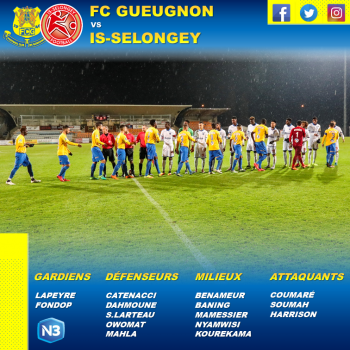 Le FC GUEUGNON a digéré de la meilleure des façons son élimination en Coupe de France contre Clermont Foot (1-3 a.p.) en l’emportant sur le terrain du Racing Besançon (1-2). Une victoire qui fait du bien au moral et qui permet de rester au contact des premiers. Certains concurrents directs n’ont pas gagné et le FCG a ainsi pu grapiller quelques points. Il reste désormais deux rencontres à disputer avant la trêve pour se rapprocher pourquoi pas encore un peu plus du haut de tableau. Il faudra commencer par battre cette équipe de Is-Selongey à la maison et offrir ainsi une victoire au public de Jean Laville avant les fêtes. Si Philippe CORREIA devrait sans doute reconduire le groupe victorieux à Besançon, on ne sait pas encore pour quelle tactique optera le coach gueugonnais à l’entame du match. Fabrice REVUELTA et Clément CORONAS sont toujours indisponibles et pourraient être absents jusqu’à la trêve. Jérôme LARTEAU et Bakeba BAYO ont eux repris l’entrainement. Franck REVUELTA, absent la semaine passée en raison de douleurs au genou doit également déclarer forfait ce samedi.