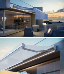 – Le store coffre plus avec leds : en démonstration pendant les portes ouvertes, ce store innovant est doté d’un lambrequin déroulable électrique ainsi que de leds sur les bras, le coffre et les joues latérales.