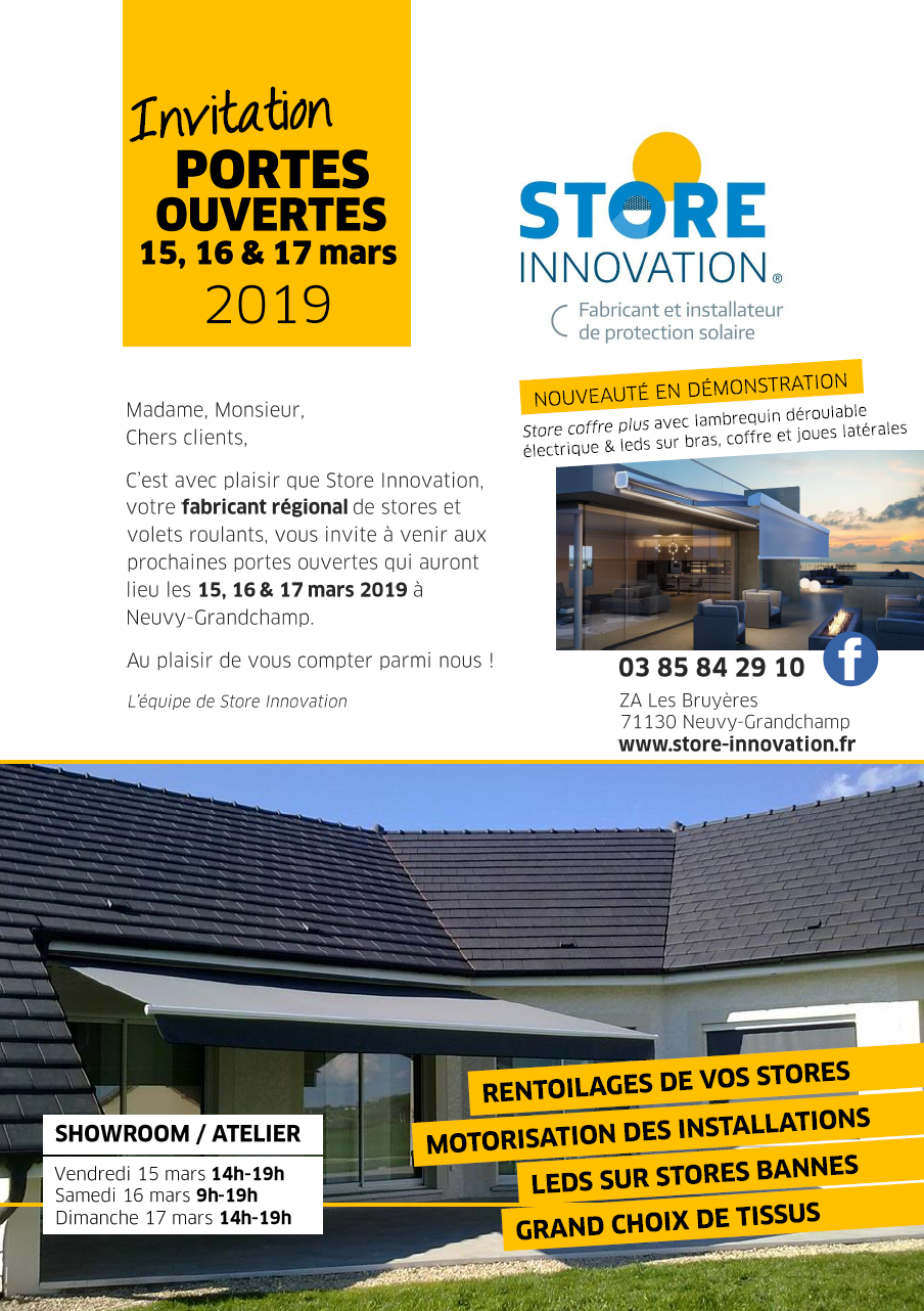 Comme chaque année, l’entreprise familiale installée près de Gueugnon ouvre les portes de son atelier & showroom aux particuliers. Spécialiste des solutions de protection solaire, Store Innovation propose aux particuliers son savoir-faire pour aménager leur habitat: volets roulants connectés, rentoilage des stores-bannes, enrouleurs en tissus, brise soleil orientable, motorisation des installations existantes.