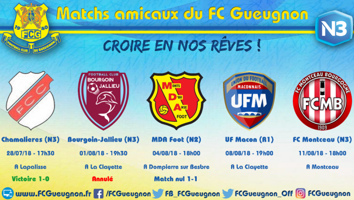 Le match de préparation FC Gueugnon – UF Mâcon se jouera finalement au Stade Municipal de La Clayette ! Nous vous attendons nombreuses et nombreux, ce mercredi 08 Août pour venir encourager les forgerons. Le coup d’envoi sera donné à 19h00.