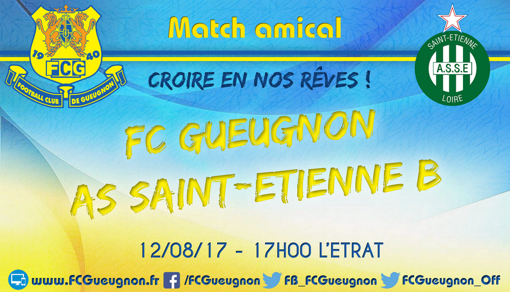 A 1 semaine de la reprise du championnat de N3 et sous la chaleur de l’Etrat, Philippe CORREIA et le staff gueugnonnais ont rejoint l’Etrat avec un groupe de x joueurs dont 2 essais (). Durant la première mi-temps ouverte au niveau du jeu, ce sont les stéphanois qui se démarquent et prennent le jeu à leur compte. Ils ouvriront le score par une belle frappe pleine lucarne de Kenny Rocha-Santos depuis les 18m (26e 1-0). En seconde période, les jaunes et bleus reviennent avec plus d’intention et se procureront plusieurs occasions sans pour autant trouver la faille dans la défense des verts.